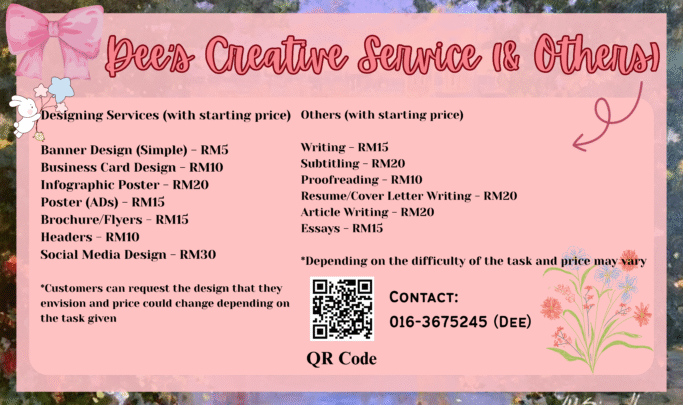 Designing Services (with starting privece) Banner Design (Simple) - RM5 Business Card Design - RM10 Infographic Poster - RM20 Poster (ADs) - RM15 Brochure/Flyers - RM15 Headers - RM10 Social Media...
